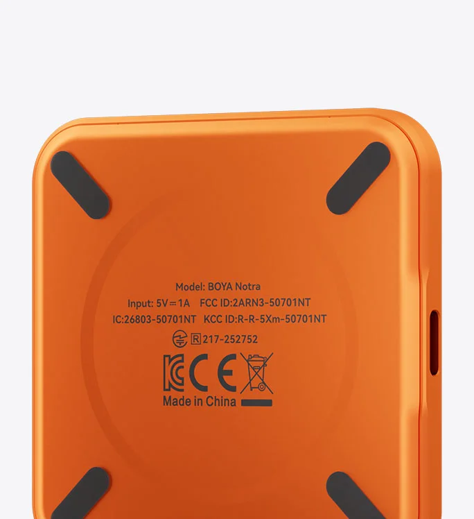 Smaller than a credit card, BOYA Notra is incredibly compact. Black and Silver remain timeless, while Cosmic Orange and Purple add a vivid pop of color to your life. Made from refined microblasted aluminum alloy, it feels impressively light yet solid in hand and stays cool even through long recording sessions.
